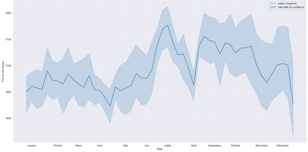 Qu’il s’agisse de l’évolution des prix ou de l’évolution du nombre de ventes, on peut observer des phénomènes similaires au cours d’une année, avec des pics aux mois de juillet ainsi qu’à la rentrée de septembre et une forte baisse en août et une autre, de moindre importance, en avril.