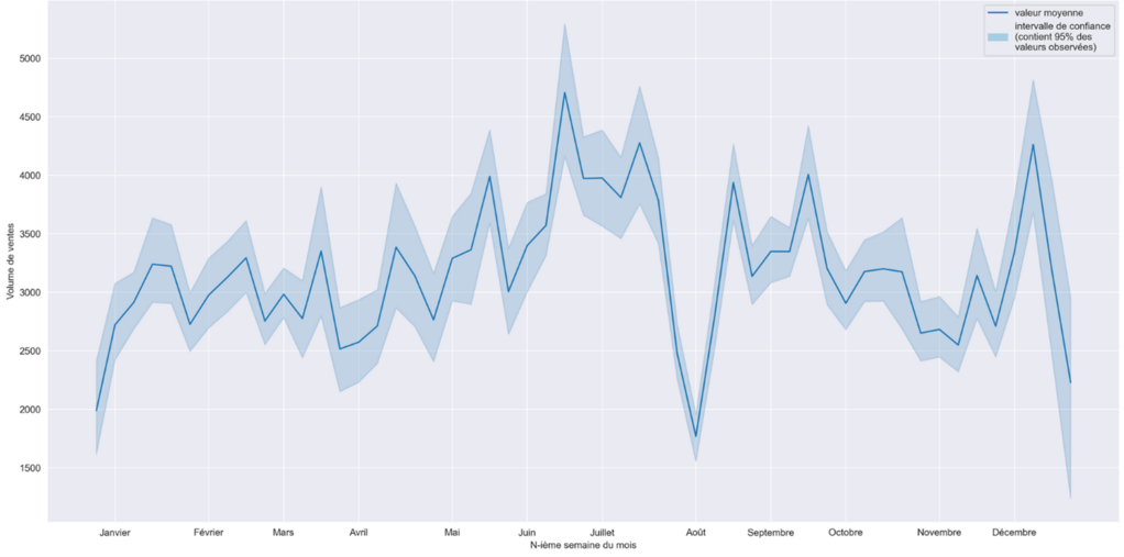 Nombre moyen de ventes pour chaque semaine de chaque année (hors week-end) (2016 à 2021 – toutes années confondues)