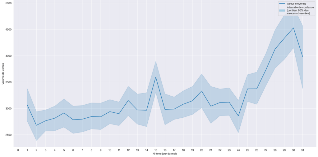 Sur ce graphique se dessinent plusieurs tendances : un plateau du nombre médian de signatures d’actes de vente entre le 1er et le 14 de chaque mois avec une moyenne de 2 545 ventes par jour, puis un léger rebond aux alentours du 15. On observe, à partir du 24, une évolution significative avec 4 430 signatures d’actes de vente en fin de mois.